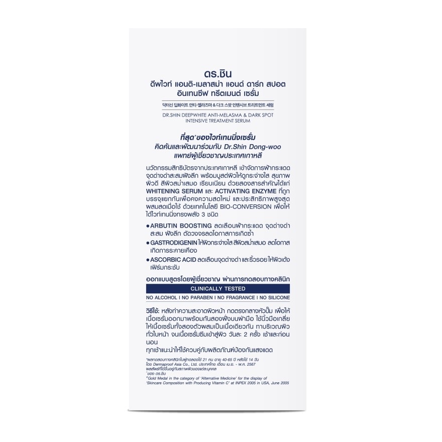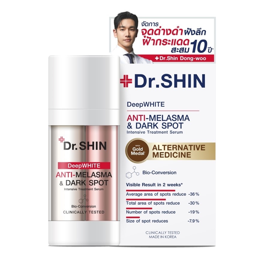Dr. Shin DeepWhite Anti Melasma & Dark Spot Intensive Treatment Serum The ultimate whitening serum, developed in collaboration with Dr. Shin Dong-woo, a leading specialist from South Korea. This Korean-patented innovation targets deep melasma, freckles, sunspots, and dark spots while boosting skin brightness, healthy, even, and smooth skin. It features two key parts: WHITENING SERUM and ACTIVATING ENZYME, which are kept separate to maintain freshness and maximum effectiveness. They are freshly mixed upon application using BIO-CONVERSION technology to deliver three powerful whitening agents: ARBUTIN BOOSTING: Reduces the appearance of deep melasma, freckles, sunspots, and dark spots, cutting off the cycle to prevent recurrence. GASTRODIGENIN: Brightens skin, evens out skin tone, and reduces the likelihood of irritation. ASCORBIC ACID: Diminishes dark spots and wrinkles, leaving the skin firm and bouncy. Formulated by experts and Clinically Tested, it has been shown that in 2 weeks, Avereage area of spots reduce 36%, total area of spots reduce 30%, the number of dark spots reduce 19%, and the size of spot reduces 7.9%. NO ALCOHOL NO PARABEN NO FRAGRANCE NO SILICONE