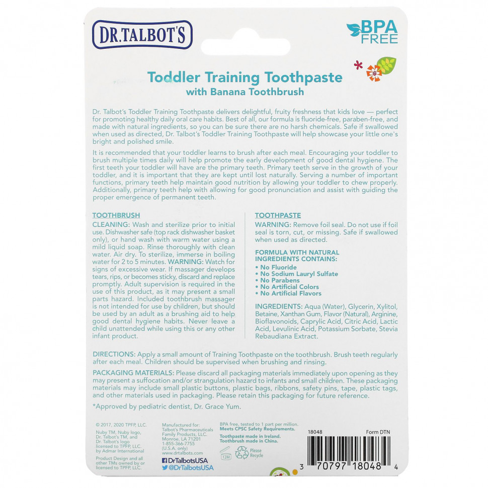 Доктор Зубная паста Talbot для малышей дарит детям восхитительную фруктовую свежесть, которая идеально подходит для ежедневного ухода за полостью рта. Лучше всего то, что наша формула не содержит фторидов и парабенов и изготовлена из натуральных ингредиентов, поэтому вы можете быть уверены, что она не содержит агрессивных химикатов. Безопасно при проглатывании и в соответствии с рекомендациями. Зубная паста для малышей от Talbot поможет продемонстрировать яркую и безупречную улыбку вашего малыша.
