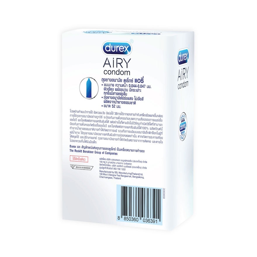 Durex Airy is the thinnest ever condom developed by Durex size 52mm with extra benefits of thinness, naturally soft, lubrication, pleasurable fit and clean scent. ใบอนุญาตโฆษณาเลขที่ 1059/2567