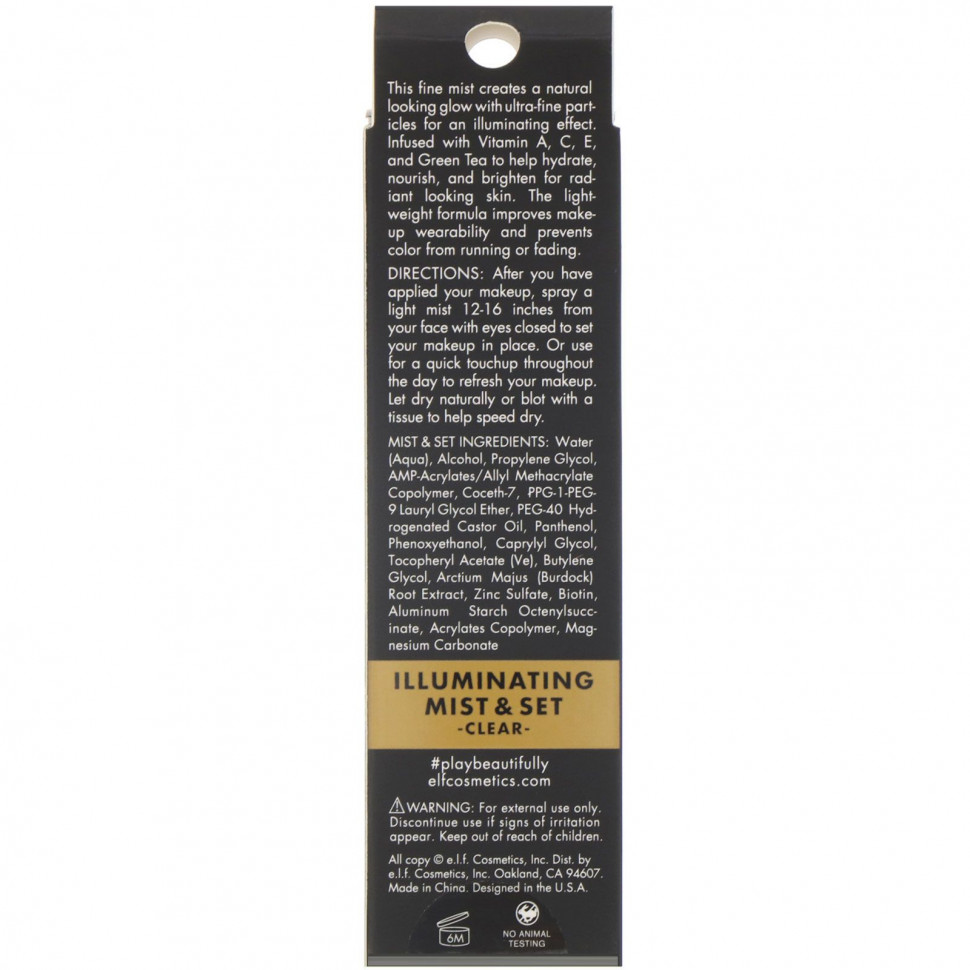 Спрей создает естественное сияние, а очень мелкие частички добавляют мерцающий эффект. Средство обогащено витаминами А, С, Е и зеленым чаем, оно способствует увлажнению, питанию и осветлению, и внутреннему сиянию кожи. Легкая формула продлевает жизнь макияжу и препятствует выцветанию и потере цвета.