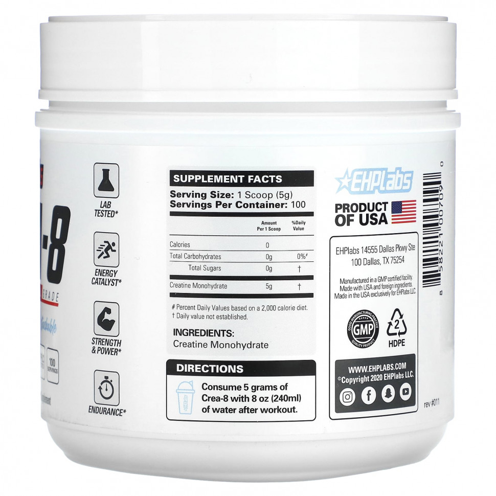 CREA-8 ™ — это биодоступный моногидрат креатина фармацевтической степени чистоты. Креатин сильно концентрируется в мышцах, где он необходим для выработки энергии за счет рециркуляции энергетической молекулы аденозинтрифосфата (АТФ). Дополнительный креатин во время подъема тяжестей и высокоинтенсивных упражнений обеспечивает сохранение запасов креатина в мышцах для удовлетворения потребностей мышц в энергии. С CREA-8 ™ вы можете быть уверены, что компания EHP Labs создала моногидрат креатина самого высокого качества для достижения ваших целей.
