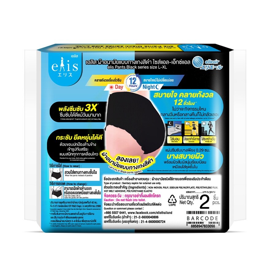 elis Pants Black Series Black Pants sanitary napkin, thin and comfortable for the skin, can be wear for up to 12 hours with 3x absorption power. Supreme absorption even on heavy days. Suitable for both day and night use. Flexible fit to your body. Remove the sanitary napkin from the package and unfold it, then remove the strip to reveal the adhesive on the back. Press the adhesive side down, onto the crotch of your underwear. And then fold the wings against the underneath of underwear. Black Pants sanitary napkin, thin and comfortable for the skin, can be wear for up to 12 hours with 3x absorption power.