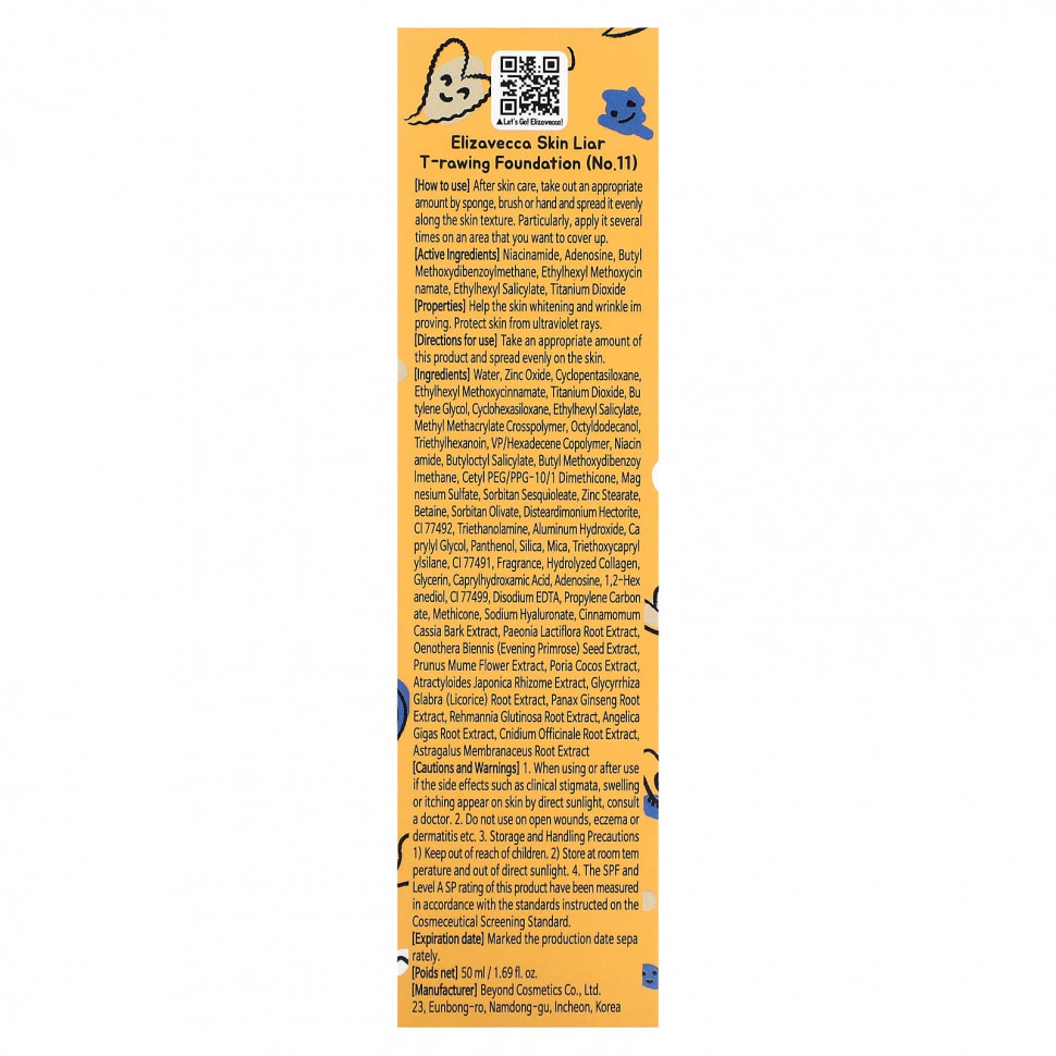 Elizavecca, Skin Liar, тональная основа T-Rawing, № 11, SPF 50+ PA +++, 50 мл (1,69 жидк. Унции)