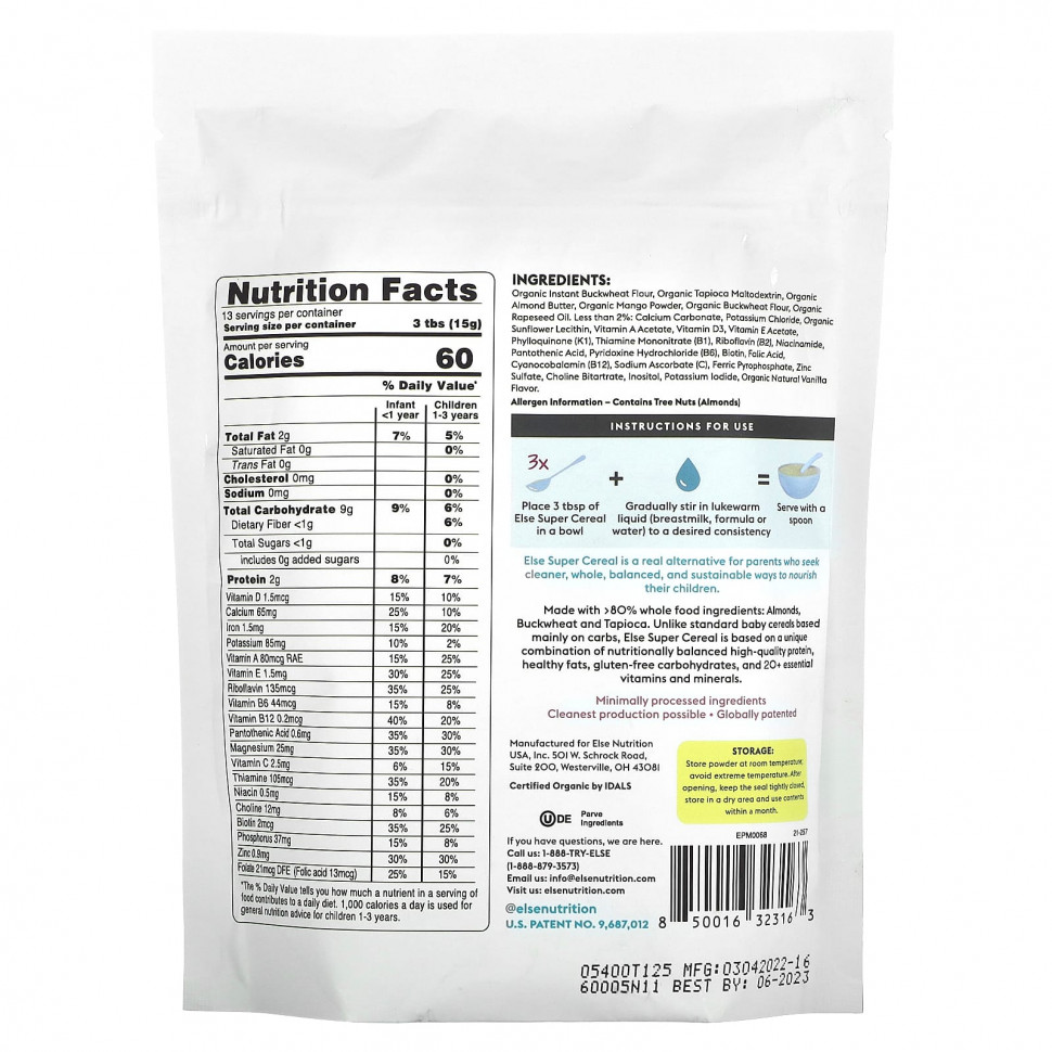 Сделано с >,80% цельных пищевых ингредиентов: Миндаль, гречка и тапиока. В отличие от стандартных детских хлопьев, в основе которых лежат углеводы, Else Super Cereal состоит из уникального сочетания питательно сбалансированного высококачественного белка, полезных жиров, безглютеновых углеводов и более 20 незаменимых витаминов и минералов.