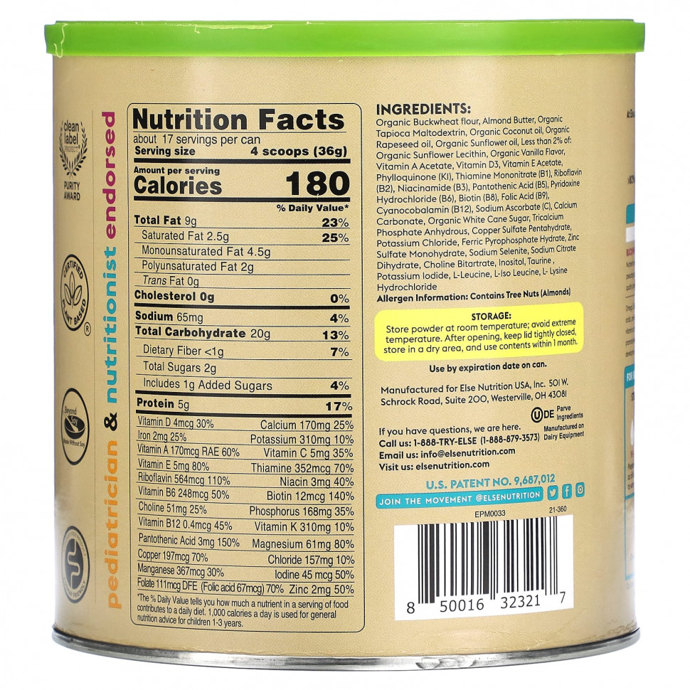 Органическая гречневая мука, миндальное масло, органический мальтодекстрин из тапиоки, органическое кокосовое масло, органическое рапсовое масло, органическое подсолнечное масло, меньше 2% следующих ингредиентов: органический подсолнечный лецитин, органический ароматизатор «Ваниль», ацетат витамина A, витамин D3, ацетат витамина E, филлохинон (KI), мононитрат тиамина (витамин B1), рибофлавин (витамин B2), ниацинамид (B3), пантотеновая кислота (B5), пиридоксина гидрохлорид (витамин B6), биотин (B8), фолиевая кислота (B9), цианокобаламин (B12), аскорбат натрия (витамин C), карбонат кальция, органический белый тростниковый сахар, безводный трикальцийфосфат, пентагидрат сульфата меди, хлорид калия, пирофосфат железа, моногидрат сульфата цинка, селенит натрия, дигидрат цитрата натрия, битартрат холина, инозитол, таурин, йодид калия, l-лейцин, L-изо лейцин, l-лизина гидрохлорид.