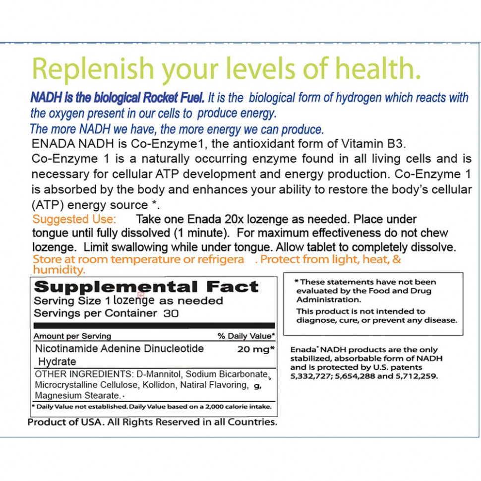 ENADA NADH — это коэнзим 1, антиоксидантная форма витамина B3. Коэнзим 1 — это фермент природного происхождения, который содержится во всех живых клетках и необходим для развития клеточного ATP и производства энергии. Коэнзим 1 усваивается организмом и увеличивает вашу способность восстанавливать источник энергии в клетках организма.