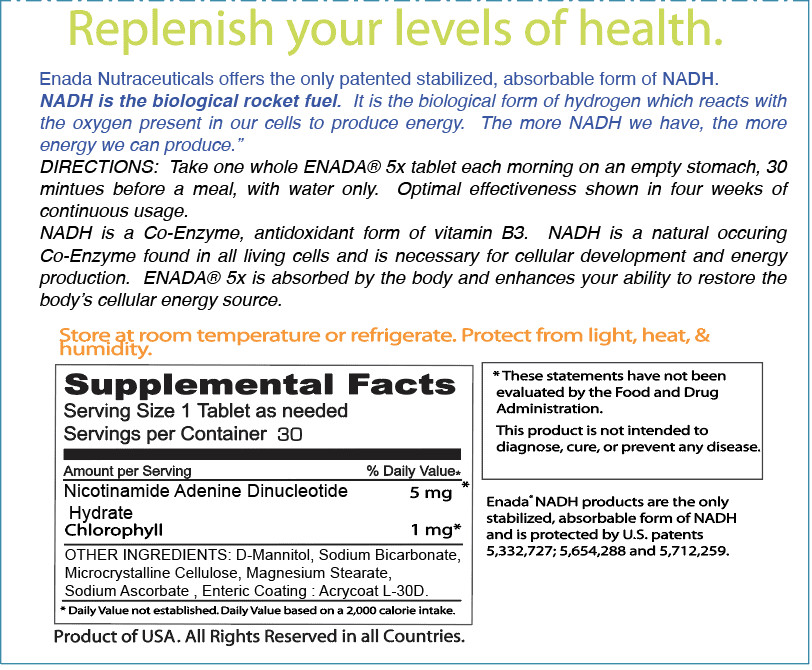 Enada Nutraceuticals предлагает уникальную запатентованную стабилизированную абсорбируемую форму NADH. NADH — это биологическое ракетное топливо. Это биологическая форма водорода, вступающая в реакцию с кислородом, присутствующим в наших клетках, для производства энергии. Чем больше у нас NADH, тем больше энергии мы можем произвести.
