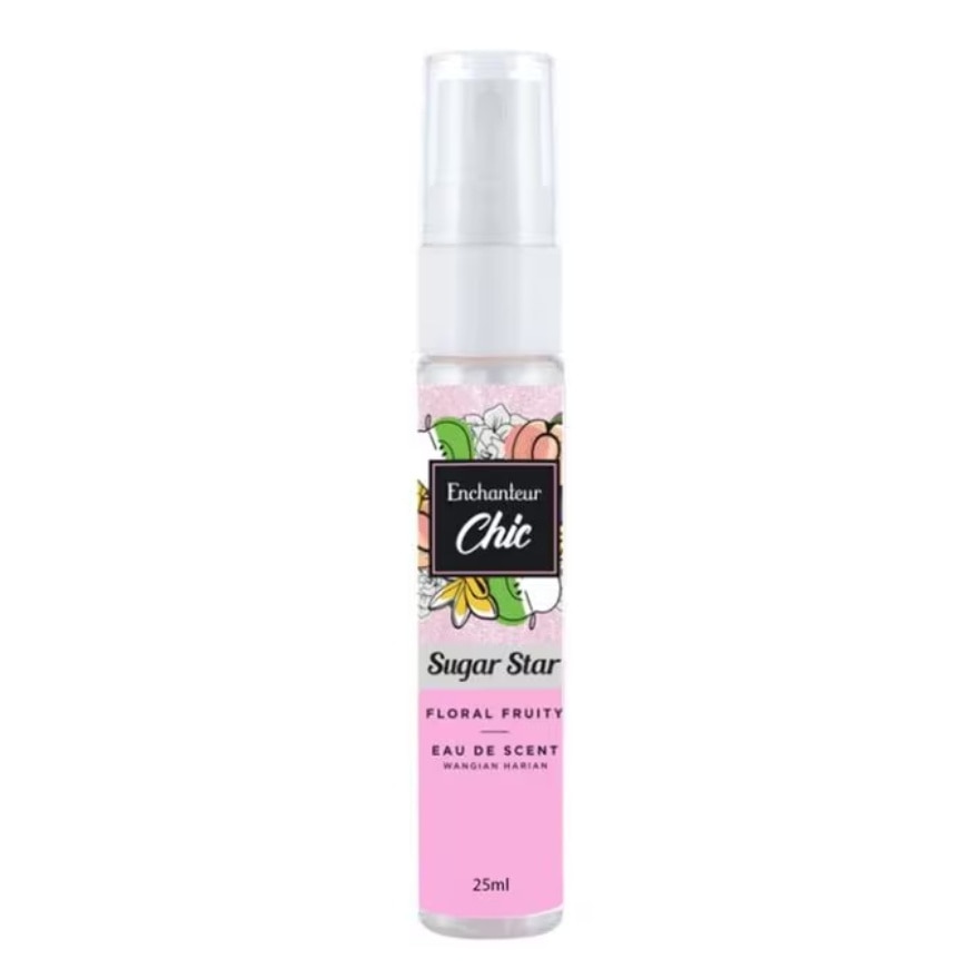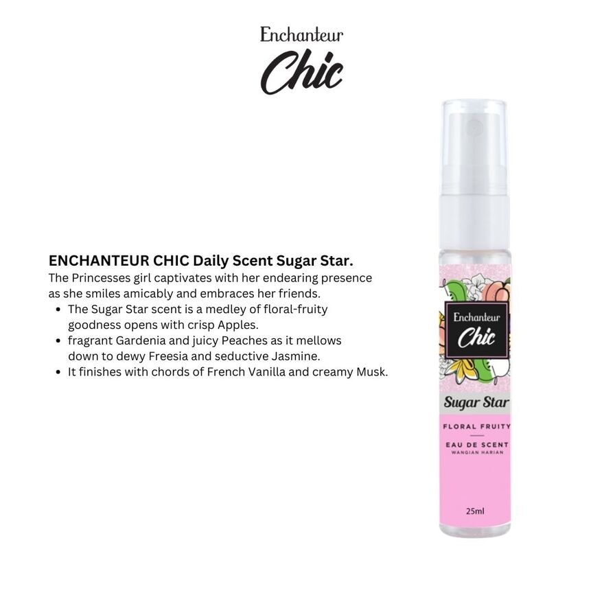 ENCHANTEUR CHIC EAU DE SCENT Daily Scent Sugar Star. The Princesses girl with her endearing presence as she smiles amicably and embraces her friends. The Sugar Star scent is a medley of floral-fruity goodness fragrant Gardenia and juicy Peaches as it mellows down to dewy Freesia and seductive Jasmine. It finishes with chords of French Vanilla and creamy Musk, Complemented by Peaches, Freesia, and Jasmine, ending with notes of French Vanilla and Musk, capturing your lasting sweetness and charm.