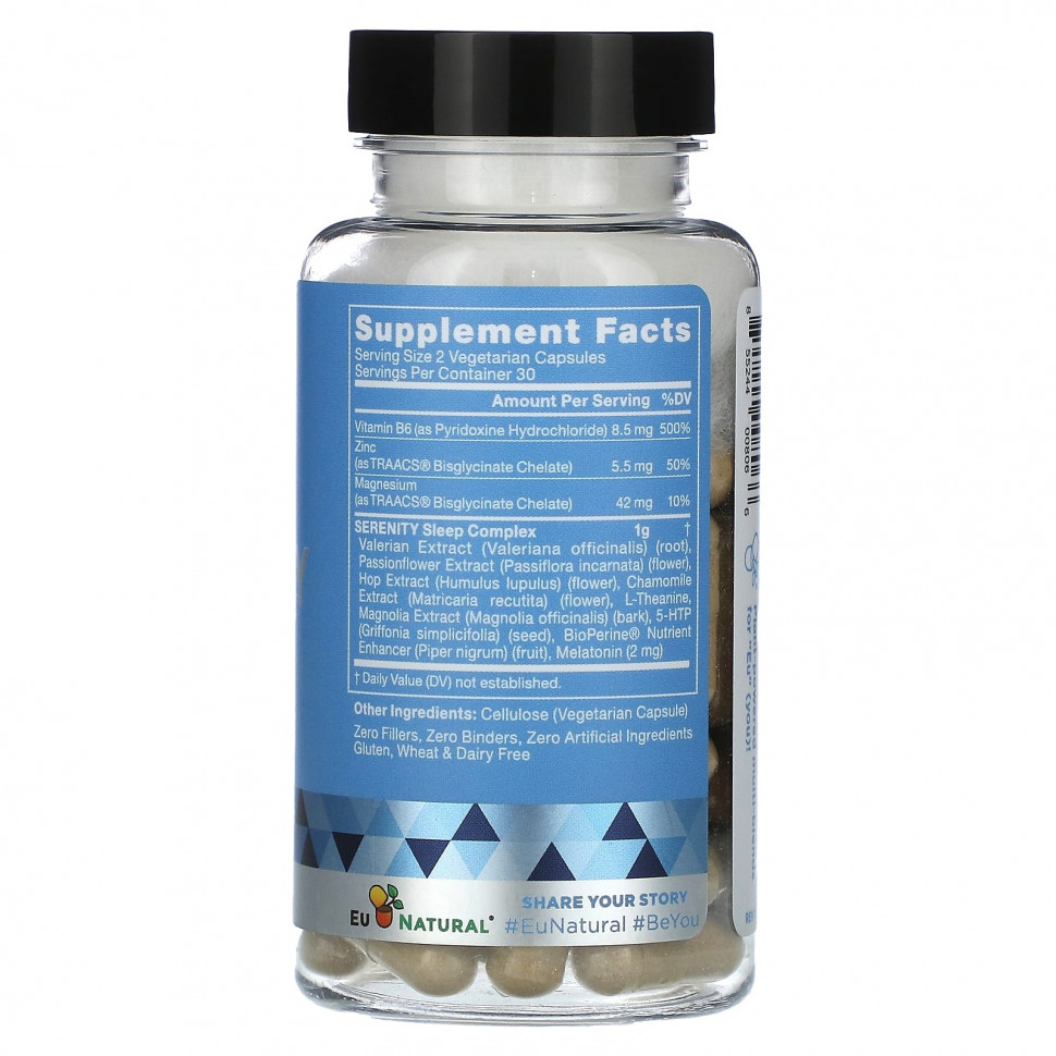 Комплекс для безмятежности Экстракт валерианы (Valeriana officinalis) (корень), экстракт пассифлоры (Passiflora incarnata) (цветок), экстракт хмеля (Humulus lupulus) (цветок), экстракт ромашки (Matricaria recutita) (цветок), L-теанин, экстракт магнолии (Magnolia officinalis) (кора), 5-HTP (Griffonia simplicifolia) (семена), BioPerineⓇ Nutrient Enhancer (Piper nigrum) (плоды), мелатонин (2 мг) |