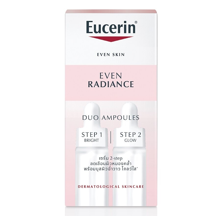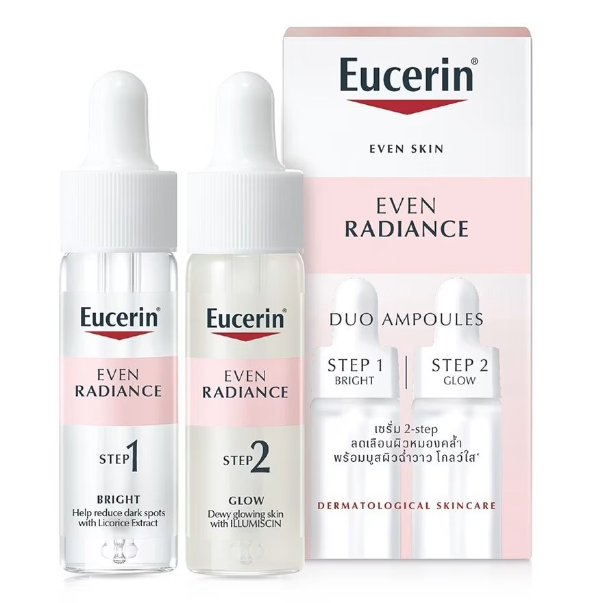 EUCERIN EVEN RADIANCE DUO AMPOULES. Step1 BRIGHT Ampoule Formula with high potent anti oxidant.Licorice extract and Niacinamide effectively reduces dullness amp; dark spots. Step 2 GLOW Ampoule Formula with Ilumiscin Niacinamide and Pro Vitamin B5 helps to hydrate and brighten skin.