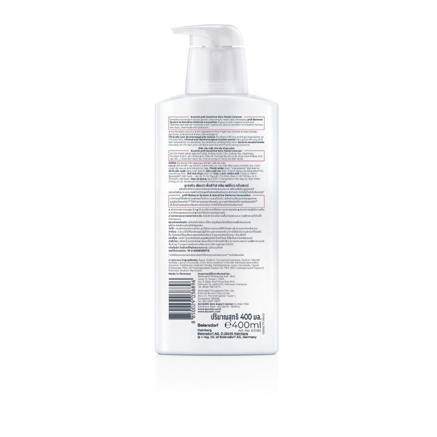 Eucerin ph Facial Cleanser 400 ml. Sensitive skin is easily irritated by environmental triggers, making it even more sensitive. It requires more than gentle cleansing to become less sensitive. Sensitive Defense Innovation from Eucerin PH5 Sensitive Skin Facial Cleanser, protects Enzyme activity which enhances dead skin cells turover. Skin therefore preserves its resilience and stay hydrated. Skin becomes healthier, not easily irritated and reactive to external aggresors. Skin is gently but effectively cleansed.