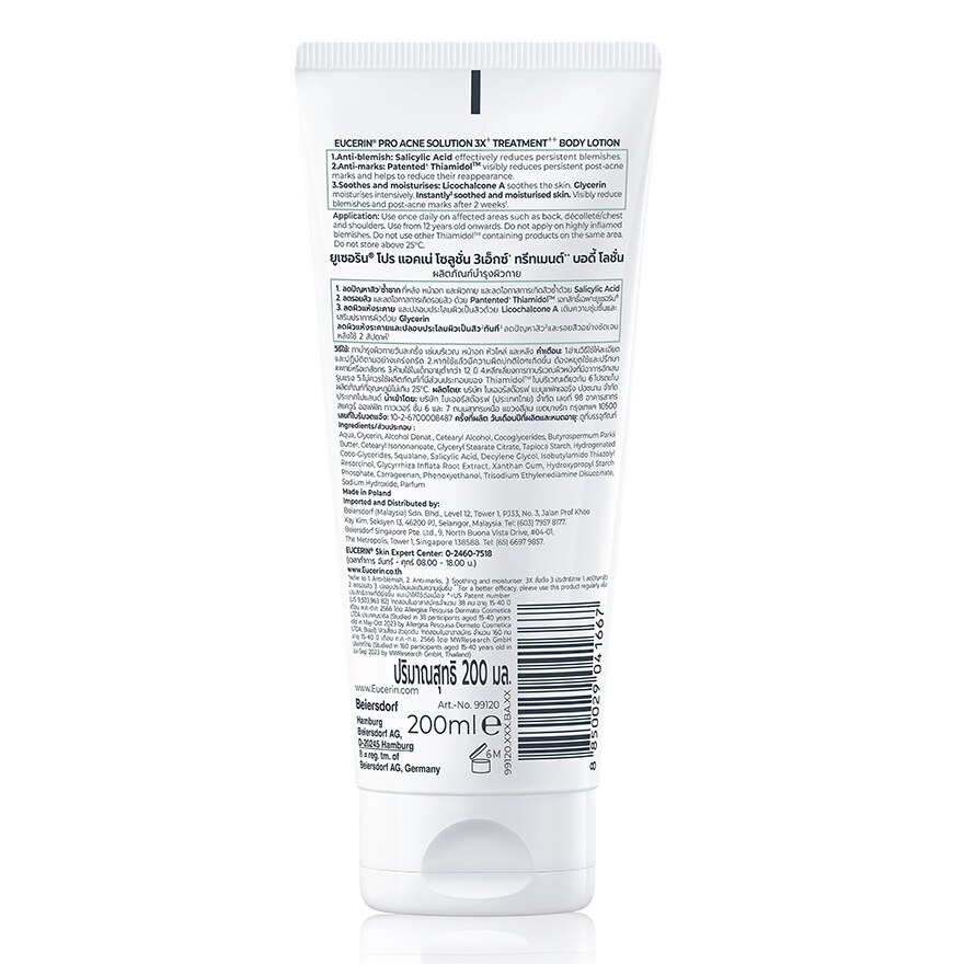 EUCERIN PRO ACNE SOLUTION 3X TREATMENT BODY LOTION 1.Anti blemish Salicylic Acid effectively reduces persistent blemishes.2.Anti marks Patented ThiamidolTM visibly reduces persistent post acne marks and helps to reduce their reappearance. 3.Soothes and moisturises Licochalcone A soothes the skin. Glycerin moisturises intensively. Instantly soothed andmoisturised skin. Visibly reduce blemishes and post acne marks after 2 weeks.