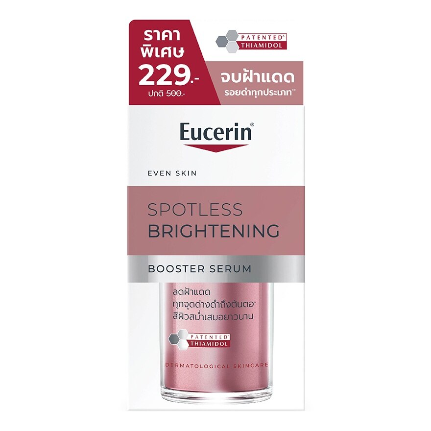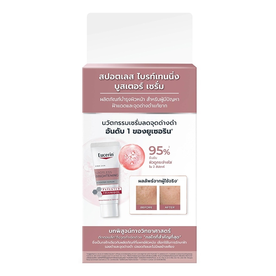 Eucerin Spotless Brightening Booster Serum. ALL TYPES OF DARK SPOTS REDUCTION Thiamidol reduces dark spots from day one with 1st visible results in 2 weeks. The patented Thiamidol reduces and corrects all types of dark spots, and prevents their reappearance. Thiamidol is effective on all skin tones.DIMINISH DARK SPOT REOCCURENCE Licochalcone A helps to protect from skin damage and reduces dark spot to reappearance.LONG TERM EVEN SKIN Maintains long lasting even skin with regular use. Hyaluronic Acid smooths fine lines, provides radiance and a firmer skin feeling.