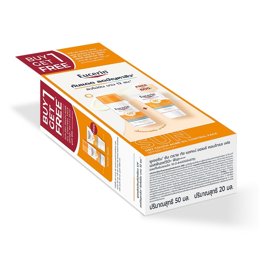 EUCERIN Sun Dry Touch Oil Control Face SPF50+ 50 ml. is a daily sunscreen with a very high sun protection factor specifically formulated for oily and acne-prone facial skin. It combines superior photo protection against sun-induced skin damage and an active solution to improve skin condition.