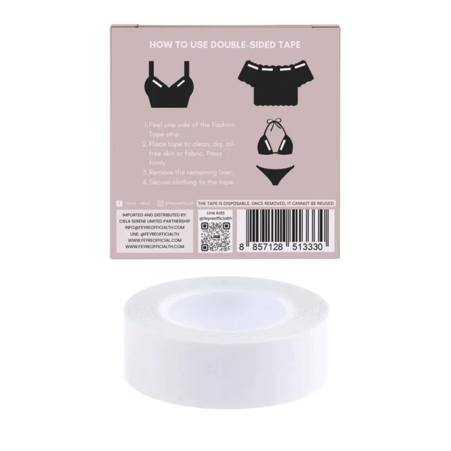 Feyre Double Sided Adhesive Fashion Tape, One box contains one roll, the tape width 1.5 cm and has 3m of length. Made of PET (Medical) Material. It is a double-sided adhesive tape that is not like a normal double-sided adhesive. It is specialized adhesive for use on skin and clothing to prevent the shirt from opening when girls bend over, suitable for wide neck shirts, deep necklines, collars, buttonholes, or patching the edge of the sleeves, skirt edge, attached to a camisole so that it does not fall off and make women feel more confidence.