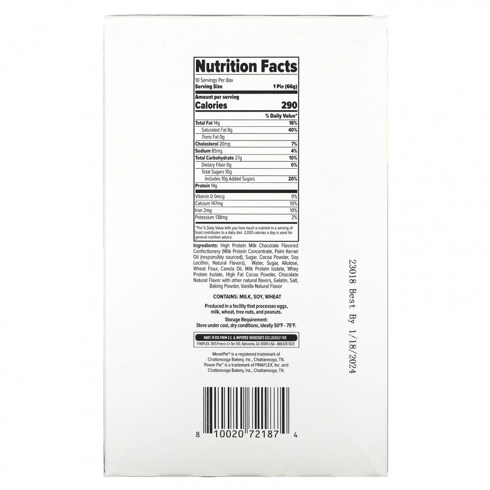 Power Pie ™, вдохновленный культовым пирогом MOONPIE®, представляет собой протеиновый снек без ГМО в молочном шоколаде, состоящий из полностью натуральных ингредиентов, в который входят два мягких жевательных печенья со сливочной начинкой из зефира и содержит 14 граммов FINAFLEX®. протеин в каждом восхитительно мощном пироге!