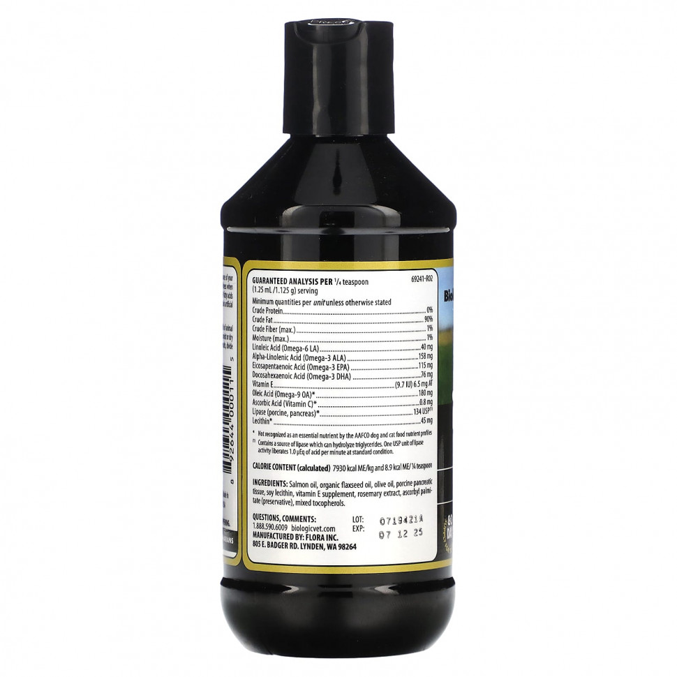 Жир лосося, органическое льняное масло, оливковое масло, ткань поджелудочной железы свиньи, соевый лецитин, добавленный витамин Е, экстракт розмарина, аскорбил пальмитат (консервант), смешанные токоферолы.