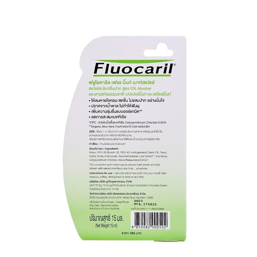FLUOCARIL MOUTHSPRAY FRESH MINT 15ML contains cool and fresh mint helped agaist bad breath from food and cigarette. Resulting from Xylitol ingredient so there is no concern about cavity.