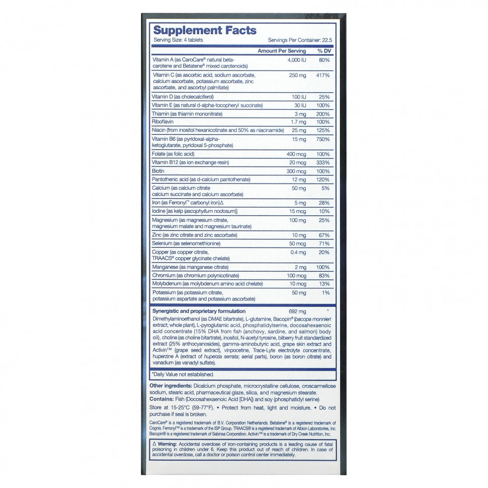 Синергетический и запатентованный состав Диметиламиноэтанол (в виде битартрата ДМАЭ), L-глютамин, Bacopin® (экстракт бакопы монье, цельное растение), L-пироглутаминовая кислота, фосфатидилсерин, концентрат докозагексаеновой кислоты (15% ДГК из жира тела рыб (анчоусов, сардины и лосося), холин (в виде битартрата холина), инозитол, N-ацетилтирозин, стандартизированный экстракт плодов черники (25% антоцианозидов), гамма-аминомасляная кислота, экстракт виноградной кожуры и Activin ™ (экстракт виноградных косточек), винпоцетин, концентрат электролитов Trace-Lyte, гуперзин A (экстракт пильчатой пильчатой, надземные части), бор (в виде цитрата бора) и ванадий (в виде ванадилсульфата). |