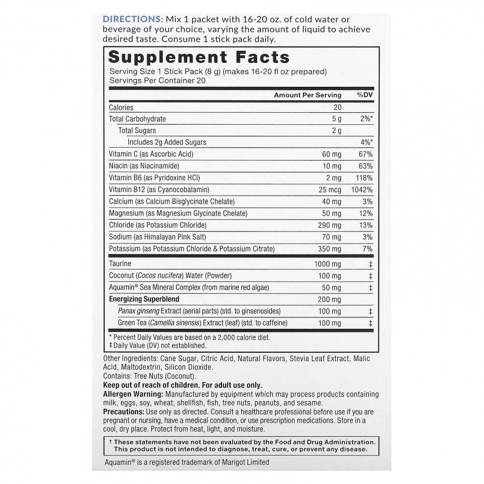 Liquid Labs ™ Hydration Optimization Matrix ™ содержит пять основных электролитов, кокосовую воду и комплекс морских минералов Aquamin®. С добавлением натурального тростникового сахара для ускорения усвоения каждый глоток увлажняет вас лучше и быстрее, чем вода. В удобных упаковках в стиках Liquid Labs, содержащих в 3 раза больше электролитов и в 10 раз меньше сахара, чем в ведущих спортивных напитках, вы сможете с легкостью поддерживать уровень водного баланса и заряд энергии от восхода до захода солнца.