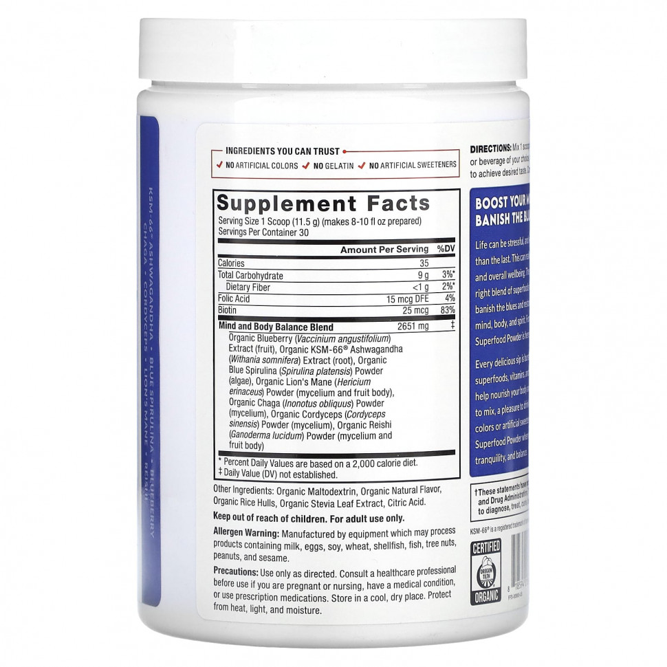 Смесь для поддержания баланса тела и разума Органическая голубика (Vaccinium angustifolium) Экстракт плодов органического ашваганды KSM-66® Экстракт корня (Withania somnifera), органический Порошок из голубой спирулины (Spirulina platensis) (водоросли), органическая львиная грива (Hericium erinaceus) порошок (мицелий и плодовое тело), Порошок из органической чаги (Inonotus obliquus) (мицелий), органический кордицепс (Cordyceps sinensis), порошок (мицелий), органического рейши (Ganoderma lucidum) Порошок (мицелий и плодовое тело) |