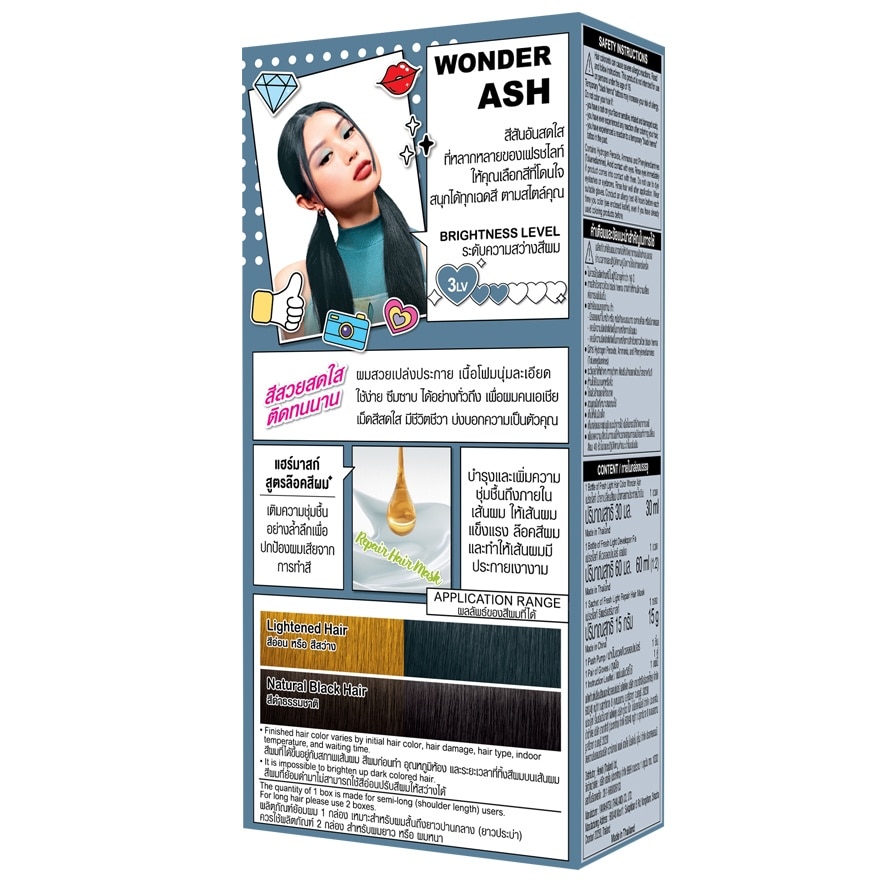 Freshlight Foam Color Wonder Ash. A softy foamy vibe of hair coloring that will provide you radiant and trendy fashion hair color to your chosen look. The product also provide a healthy touch and look during and after coloring with Freshlight Hair Mask Special formula. The Freshlight color locked hair mask to be using after washing will give you a shiny, smooth and soft hair. This special formula of hair mask also give you last longer bautiful hair color. Freshlight Foam comes with a pumping bottle for your convenience at use so you coud enjoy the foaming feel and easily apply evenly on your hair.