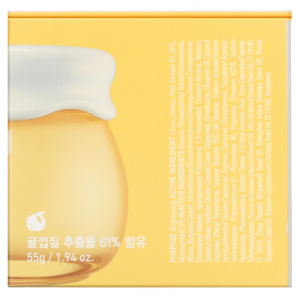 Благодаря содержанию экстракта кожуры мандарина Чеджу с высоким содержанием витамина С (61%) вместо воды этот крем осветляет кожу и делает ее более яркой. Этот крем не только улучшает цвет кожи за 4 недели, но и осветляет пигментированные участки (веснушки) за счет уменьшения количества меланина в коже. Кроме того, комплекс масел из косточек манго и других фруктов придает коже сияние, оказывая сильное увлажняющее действие. Крем с мандарином имеет нежную текстуру и подходит для чувствительной кожи, что подтверждено результатами соответствующего тестирования.