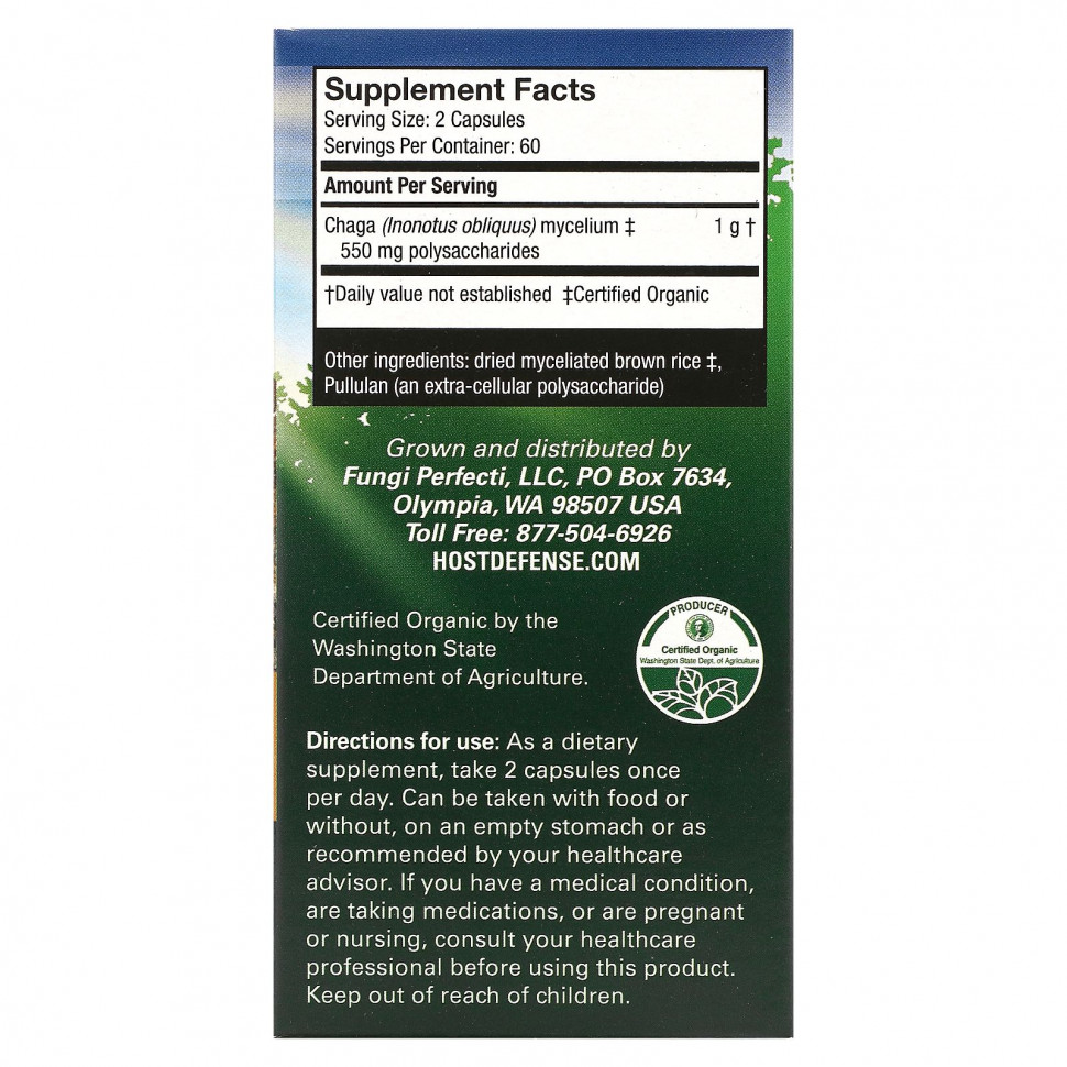 Чага от Host Defense представляет собой активированный, оптимально высушенный, сертифицированный органический грибной мицелий с полным спектром компонентов: >,55% (550 мг/порция) полисахаридов и множество внеклеточных компонентов и других миконутриентов, необходимых для поддержания естественного иммунитета.