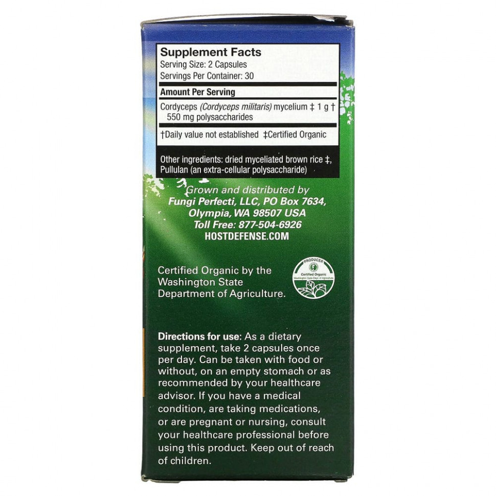 Кордицепс от Host Defense включает активированный, оптимально высушенный, сертифицированный органический грибной мицелий с полным спектром компонентов: >, 55% (550 мг/порция) полисахаридов и множество внеклеточных компонентов и других миконутриентов, необходимых для поддержания естественного иммунитета.