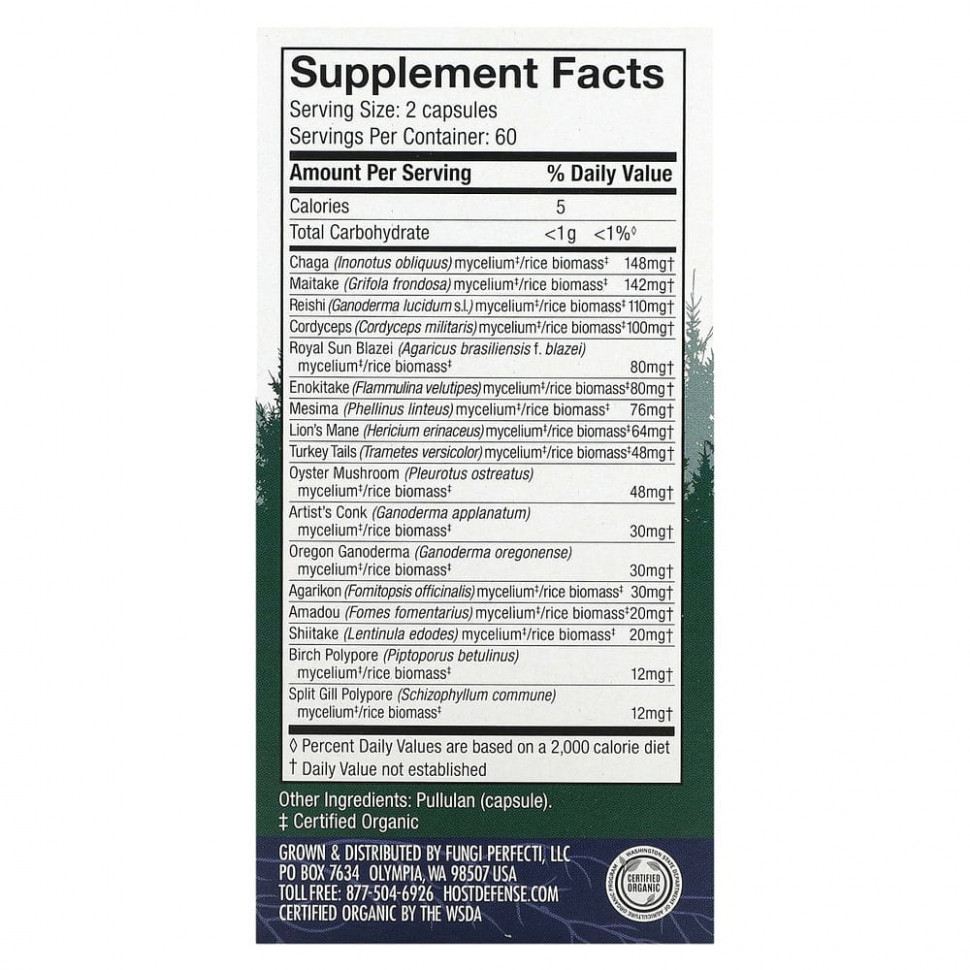 MyCommunity® от Host Defense® использует активированный, высушенный при оптимальной температуре, сертифицированный органический грибной мицелий и плодовые тела с полным спектром компонентов: >,55% (550 мг в 1 порции) полисахаридов и множество внеклеточных компонентов, включая пребиотики для микробиома, важные для поддержания естественного иммунитета.