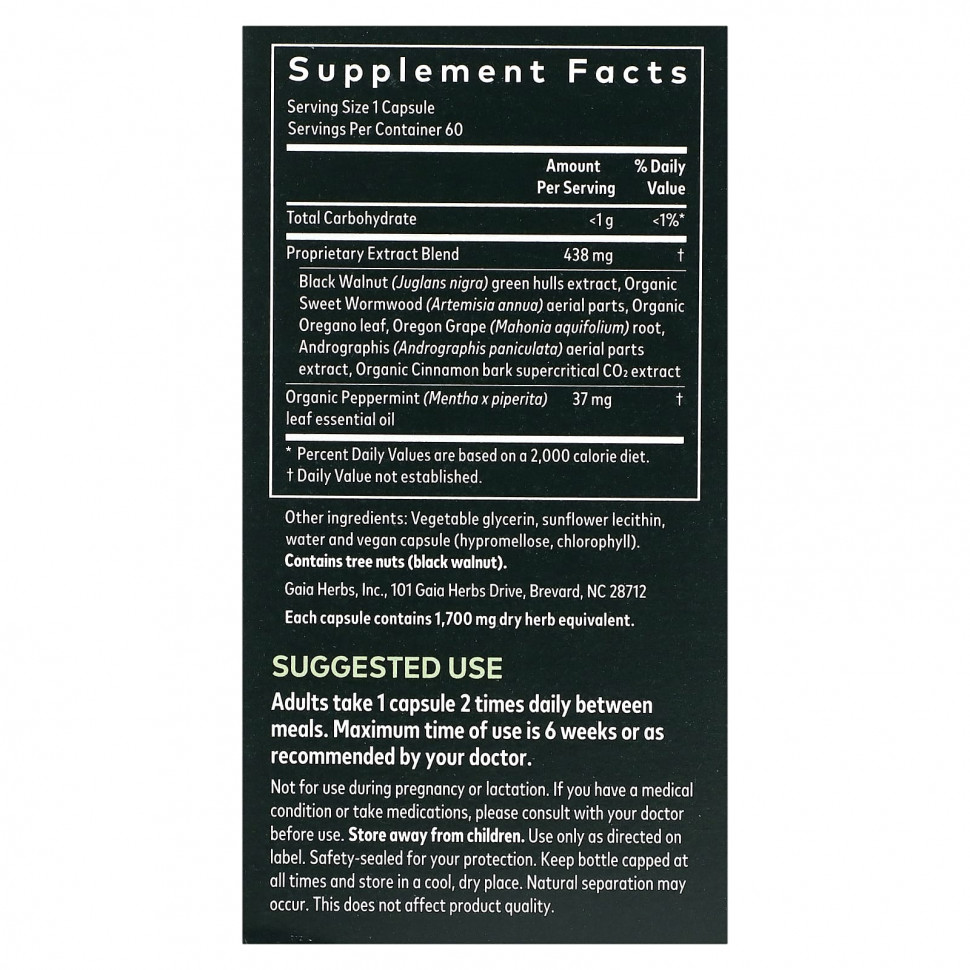 | Запатентованная смесь экстрактов Экстракт зеленой оболочки черного ореха (Juglans nigra), надземные части органической полыни (Artemisia annua), листья органического орегано, корень орегонского винограда (Mahonia aquifolium), экстракт надземных частей андрографиса (Andrographis paniculata), сверхкритический CO2-экстракт коры корицы. |