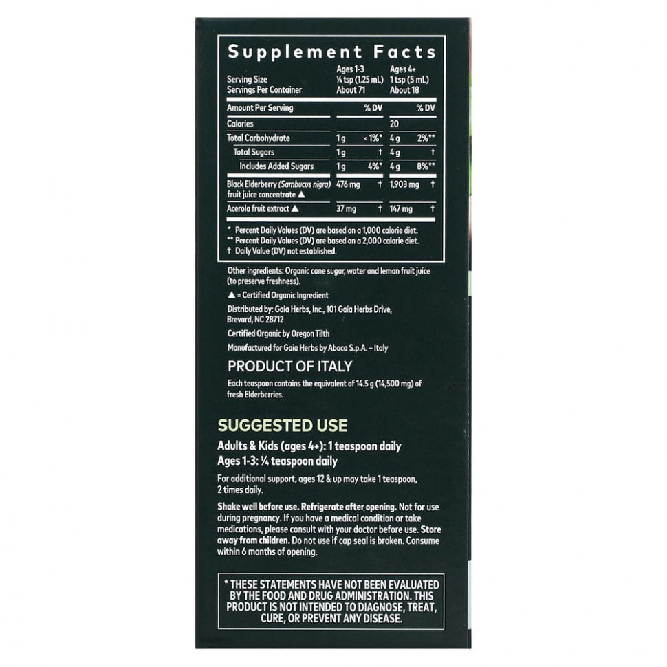 Сироп из черной бузины производится в Тоскане, Италия, компанией Aboca, с 1978 года являющейся лидером по поставкам травяных добавок в Европе. Партнерство Gaia Herbs с Aboca обусловлено взаимной верой в устойчивую разработку продуктов, преданностью качеству и глубоким уважением к гармонично взаимодействующим науке и природе.