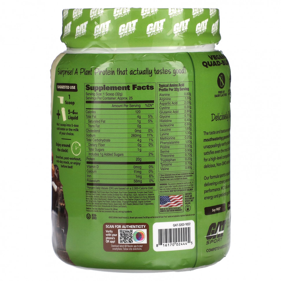 Вкус и текстура аппетитных изысканных вкусов GAT Sport Plant Protein по-настоящему важны. В отличие от других непривлекательных растительных белков, GAT Plant Protein удовлетворяет даже самые взыскательные вкусовые рецепторы. Он идеально подходит для спортсменов высокого уровня и для всех, кто ищет вкусный источник белка без ГМО и молочных продуктов.