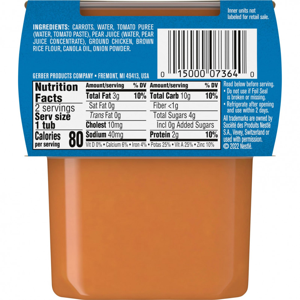 Морковь, вода, томатное пюре (вода, томатная паста), грушевый сок (вода, концентрат сока груши), куриный фарш, мука из коричневого риса, рапсовое масло, луковый порошок.