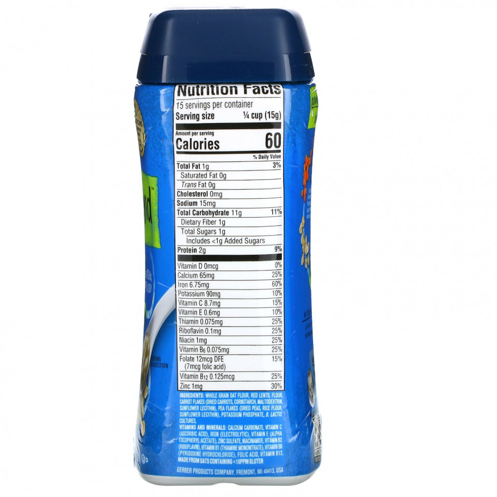 Первая каша для младенцев, изготовленная из цельнозерновой овсянки, бобовых и овощей без глютена, призванная пробудить в ребенке любовь к питательной пище. Каждая порция содержит 11 г цельного зерна, 2 г растительного белка, 1/3 порции овощей? и пробиотики B. lactis? для поддержания здоровья пищеварительной системы и сбалансированного микробиома.