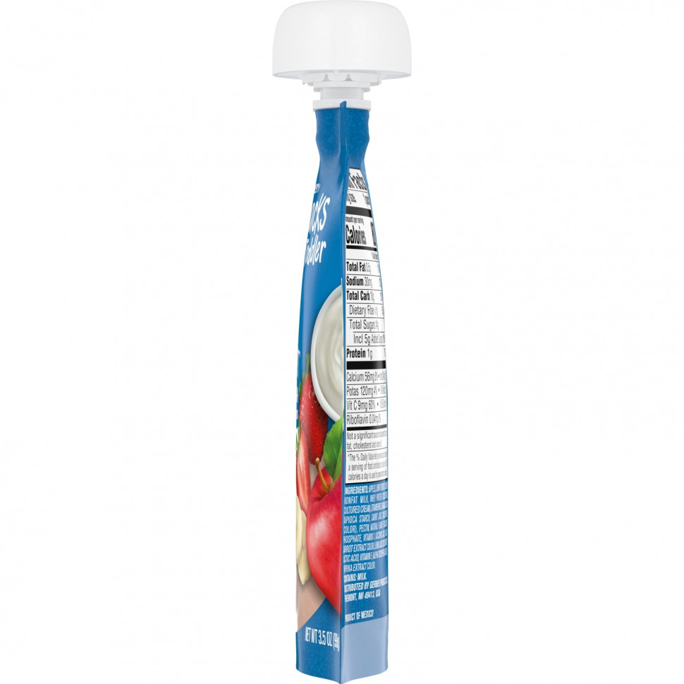 Яблоки, обезжиренный йогурт (обезжиренное молоко, концентрат сывороточного протеина, кисломолочные), клубника, бананы, сахар, тапиоковый крахмал, концентрат морковного сока (краситель), пектин, натуральный ароматизатор, трикальцийфосфат, витамин С (аскорбиновая кислота), экстракт черной моркови, концентрат лимонного сока, молочная кислота, витамин E (альфа токоферола ацетат), экстракт паприки краситель.