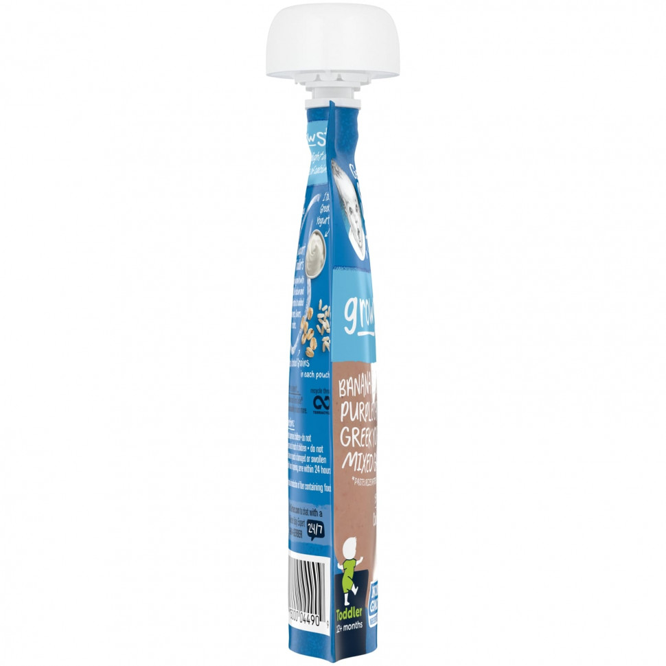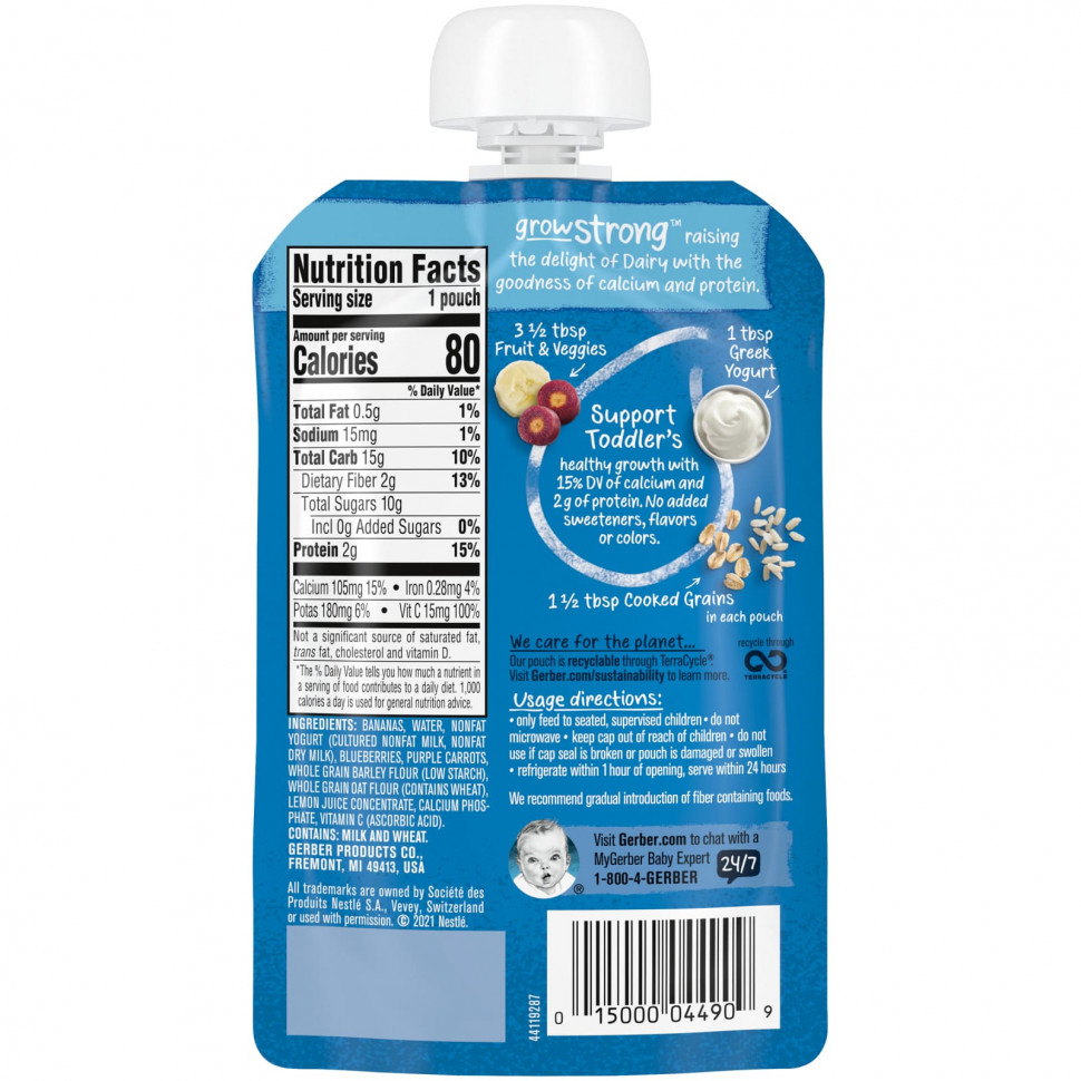 Бананы, вода, обезжиренный йогурт (обезжиренное молоко, обезжиренное сухое молоко), голубика, фиолетовая морковь, цельнозерновая овсяная мука (содержит пшеницу), цельнозерновая мука (содержит пшеницу), концентрат лимонного сока, фосфат кальция, витамин С (аскорбиновая кислота).