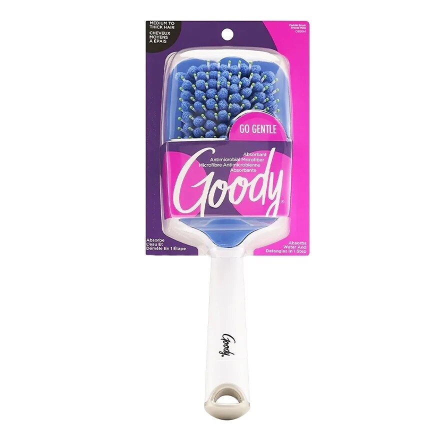 Goody Quikstyle Flow Paddle Brush Save time by removing water, detangling, and drying hair all in one step. Absorbent microfiber bristles remove excess water while comfortable plastic bristles gently detangle. New vented back for faster blow drying and styling. Antimicrobial properties inhibit mold or mildew growth on microfiber bristles. Ideal for thick and medium to long hair. Speed up your styling routine with Goody Quik Style Flow the must have brush that dries and detangles your hair at the same time. Unique microfiber bristles absorb water while nylon bristles gently remove tangles, so you can dry and style your hair in one step. The open vented back ensures maximum airflow during blow drying to complete the styling routine even faster. It’s like a towel and a brush in one