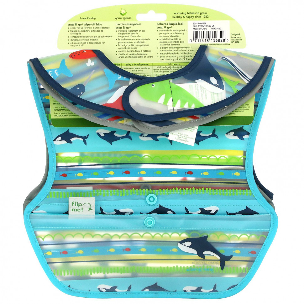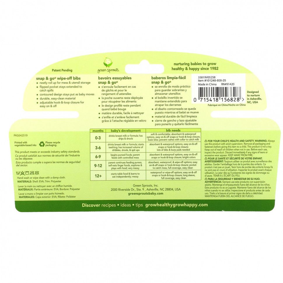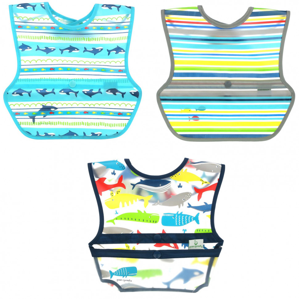 | 6-9 | Begins pureed foods, parent feeds with controlled mess | Absorbent & waterproof options, easy on-&-off snaps or hook-&-loop closure, bright colors |
