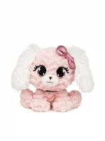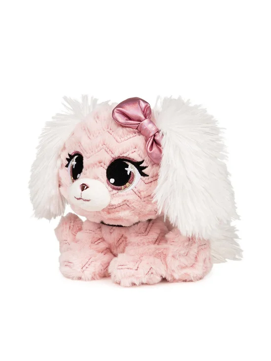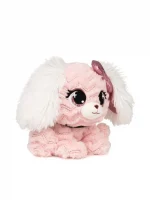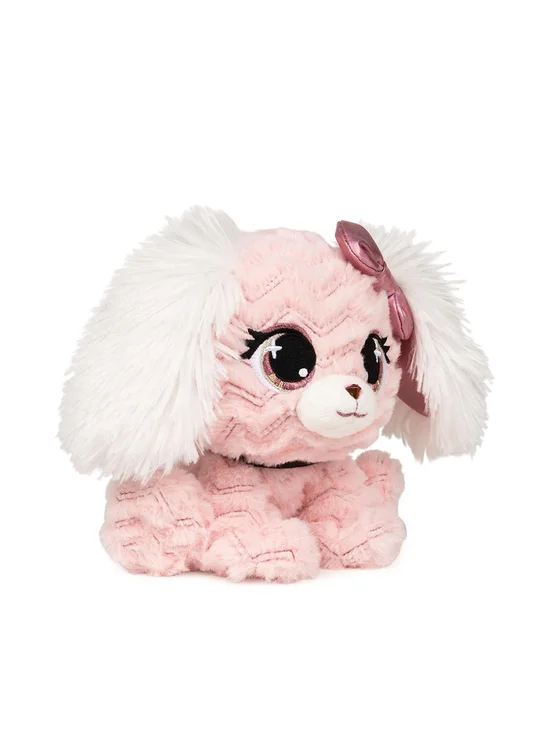 A sweet little dog doll, Sabrina Von Stuebner, brand GUND, with soft, fluffy pink fur and lined with chevron pattern fabric. Fluffy white ears decorated with a beautiful bow. The eyes are sparkling and very cute. Very cuddly. Suitable for collecting in the Collection Gem Stars of P.Lushes Pets, a team of super chic fashionistas with chic styles, complete with 12 styles. The fabric and fur have many sparkles. Luxurious, premium fabrics and a shimmering collar complete the fashion-inspired look. Can be wiped clean or washed. Suitable for children, size 6 inches, ages 3 years and up, authentically licensed from Gunds and Spinmaster.