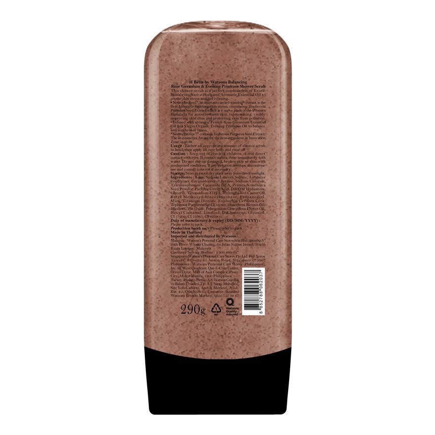 H Bella By Watsons Balancing Rose Geranium Evening Primrose Shower Scrub. This shower scrub is a perfect combination of Exotic Himalayan Native Herb and Aromatic Essential Oil to soothe skin stress and feel relaxing. NeurophrolineTM, an innovative award-winning extract, is the first bioactive fighting skin stress, containing Tephrosia Purpurea Seed Extract which is a native plant of the Western Himalaya for anti-tiredness skin, rejuvenating, visibly improving skin tone and protecting skin from pollution. Infused with aromatic French Rose Geranium Essential Oil and Virgin Organic Evening Primrose Oil to balance and soothe skin stress. NeurophrolineTM contains Tephrosia Purpurea Seed Extract. The in-cosmetics Award for the best ingredient in Innovation Zone in 2016.