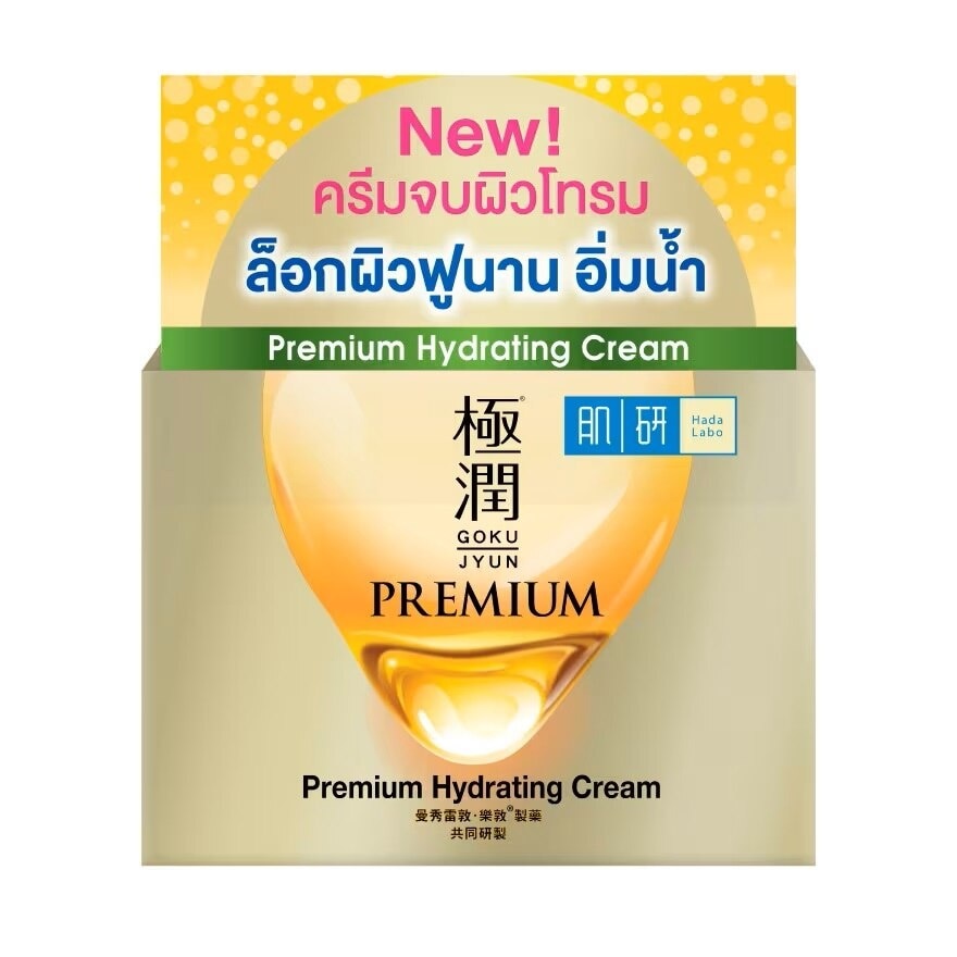 Hada Labo Premium Hydrating Cream Facial cream for skin rejuvenation With 5 types of Hyaluronic Acid. Facial cream with premium formula, help to revitalize and nourish dehydrated skin. Turn tired skin into well hydrated skin and smooth. — 5 HA Super, Medium, Small, 3D and Nana Hyaluronic Acid that immerse different skin layers with intense moisture for healthy hydrated skin. — 3 Peptides Minimize the appearance of fine lines — Collagen Help to improve skin density and elasticity to keep skin visibly tighter, firmer and more lifted. Light velvety texture, easily absorb Mild formula. No alcohol, mineral Oil, fragrance and colorant.