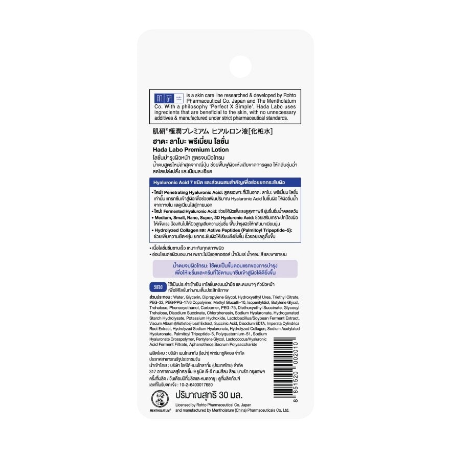 Hada Labo Premium Lotion Facial lotion for skin rejuvenation The newest formulation from Japan provides intense hydration to rejuvenate skin for a more bouncy, smooth and firm skin. With 7 types of Hyaluronic Acid and active firming ingredients — New Penetrating Hyaluronic Acid Special formulation for Hada Labo Premium Lotion. Help promoting the production of Hyaluronic Acid within skin for glowing complexion. — New Fermented Hyaluronic Acid Keep skin healthy-looking and moist-full all day. — Medium, Small, Nano, Super, 3D Hyaluronic Acid Strongly bind together and form a powerful layer of moisture-locking barrier for intense hydration. Skin is significantly soft, smooth and supple. — Hydrolyzed Collagen and Active Peptides (Palmitoyl Tripeptide-5) Improve skin density and elasticity to keep skin visibly tighter, firmer and more lifted. Minimize the appearance of fine lines. — Easily absorb texture, giving comfortable and non-sticky feeling. — Mild formula for sensitive skin. No alcohol, mineral oil, fragrance, colorant and paraben. Patting lotion for skin rejuvenation use as 1st step to prepare skin before applying other skin care products.