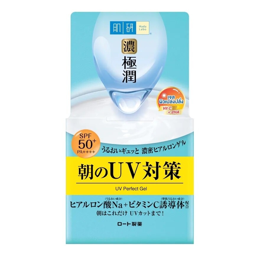 Hada Labo UV Perfect Gel SPF 50+ PA++++ Facial gel Day time gel, newest formulation from Japan. Help to hydrated and brighten skin. Protect skin from sunlight. — Vitamin C Helps to reduce dullness, brighten skin. — Hyaluronic Acid and Nano Hyaluronic Acid Helps to strengthen skin barrier, protect moisture loss, hydrated skin and make skin healthy, smooth and soft. — SPF 50+ PA++++ Protect skin from sunlight — Make up base Prepare skin to be smooth and glow. Ready for make up. — Gel texture, fast absorption — Gentle to skin, no fragrance, colorant and mineral oil.