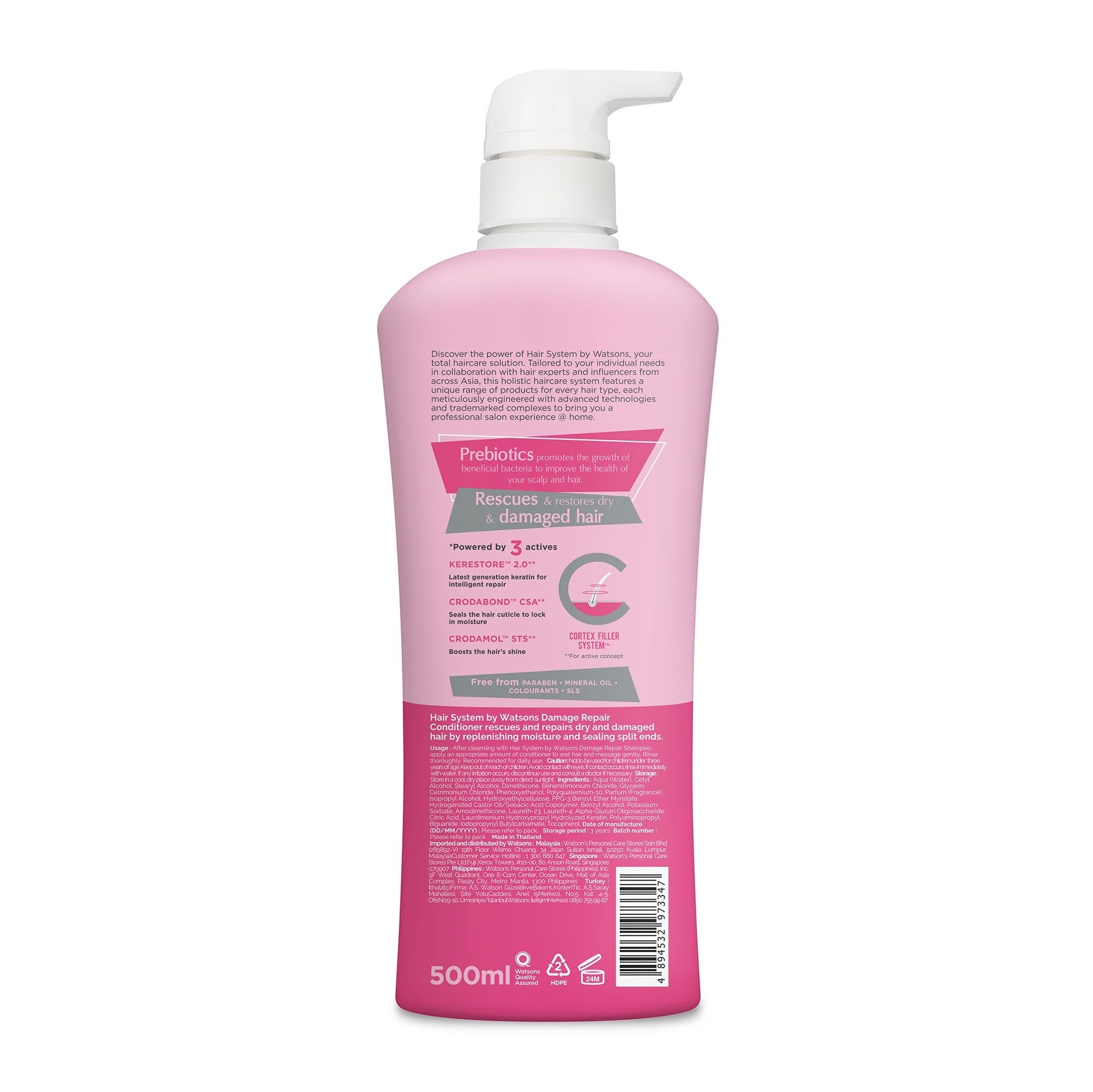Hair System By Watsons Damage Repair Conditioner.Discover the power of Hair System by Watsons,your total haircare solution.Tailored to your individual needs in collaboration with hair experts and influencers from across Asia,this holistic haircare system features a unique range of products for every hair type,each meticulously engineered with advanced technologies professional salon experience @ home.Prebiotics promotes the growth of beneficial bacteria to improve the health of your scalp and hair. Rescues & restores dry & damage hair.Powered by 3 actives.KERASTORETM 2.0**Latest generation keratin for intelligent repair CRODABONDTM CSA** Seals the hair cuticle to lock moisture CRODAMOLTM STS** Boosts the hair's shine.