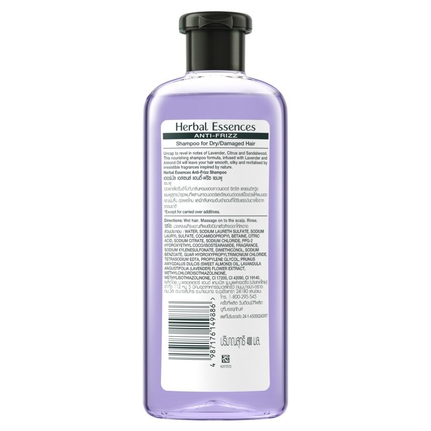 Herbal Essences Shampoo Lavender Anti Frizz Looking for a lavender-scented shampoo that takes care of damaged hair Herbal Essences Classics Lavender with Almond Oil Natural Anti Frizz Shampoo deeply repairs, controls frizz, and nourishes hair leaving it smooth, silky, and revitalised by irresistible fragrances inspired by nature. WHY IT'S THE PERFECT HAIR SHAMPOO FOR YOU — Made with real scents inspired by nature, controls frizz, for dry and damaged hair. — Enjoy the scents of lavender, citrus, and sandalwood. — Recognised by PETA as cruelty-free. — Packaged in a recyclable bottle. DIRECTIONS FOR USE Wet hair. Massage onto the scalp. Rinse. OUR RECOMMENDATIONS Use together with Herbal Essences Classics Lavender with Almond Oil Natural Anti Frizz Conditioner for the best results. OUR FREE-FROM LIST — 0% mineral oils — Paraffin-free Except for carried over additives. WHY LAVENDER Lavender has been used for centuries in many different regions and cultures. It is most famous for its relaxing scent, but it also possesses beneficial properties for hair. It is antimicrobial, soothes aggravated scalp, and nurtures hair strands.