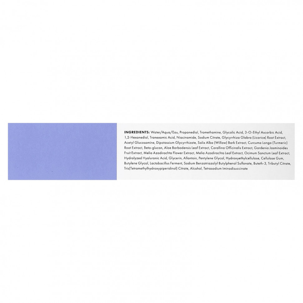 Вода (eau), пропандиол, трометамин, гликолевая кислота, 3-о-этил-аскорбиновая кислота, 1,2-гександиол, транексамовая кислота, никотинамид, цитрат натрия, экстракт корня солодки (Glycyrrhiza glabra), ацетилглюкозамин, дикалия глицирризат, экстракт коры ивы (Salix alba), экстракт корня куркумы (Curcuma longa), бета-глюкан, экстракт листьев алоэ вера (Aloe barbadensis), экстракт кораллины лекарственной (Corallina officinalis), экстракт плодов гардении жасминовидной (Gardenia jasminoides), экстракт цветков дерева ним (Melia azadirachta), экстракт листьев дерева ним (Melia azadirachta), экстракт листьев базилика священного (Ocimum sanctum), гидролизованная гиалуроновая кислота, глицерин, аллантоин, пентилен гликоль, гидроксиэтилцеллюлоза, целлюлозная камедь, бутиленгликоль, фермент лактобактерий (Lactobacillus), бензотриазолил бутилфенол сульфонат, бутет-3, трибутил цитрат, трис (тетраметилгидроксипиперидинол) цитрат, спирт, иминодисукцинат натрия.