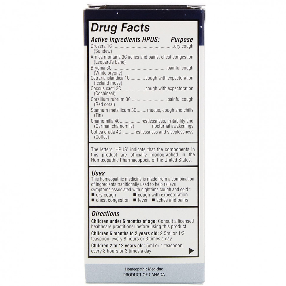 Это гомеопатическое лекарство изготовлено из комбинации ингредиентов, традиционно используемых для облегчения симптомов, связанных с ночным кашлем и простудой *: