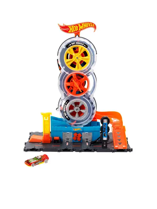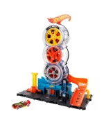 Tackle multiple twists and turns in the Hot Wheels City Super Twist Tire Shop. Spin the center key and move cars through the translucent wheels of the shop. Once they reach the top, they stunt down the ramp, off to new adventures. Connect the base to other Hot Wheels sets (sold separately). Include 1 Hot Wheels car, but up to 4 can twist through the tire structure at once (additional cars sold separately). Realistic details like a kid-activated lift, spinning tire display and gas pump.