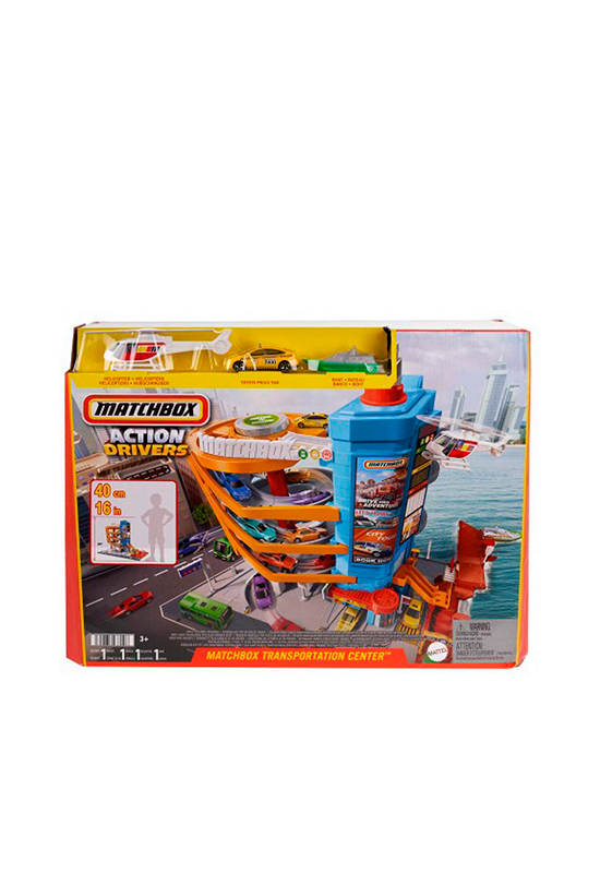 Take off for exciting adventures on land, in the air or at sea with the Matchbox Action Drivers Transportation Center. This epic playset features a five-level parking garage, boat dock and helipad and includes a 1:64 scale taxi, boat and helicopter for realistic storytelling. Drive up to the passenger loading zone to activate the revolving door and reveal arriving passengers. Be sure to check the food vendor in case they stopped for a snack. Take the kid-powered lift into the parking structure that can store 12 die-cast vehicles and, when the helicopter lands on the helipad, it sends the vehicles swirling down the garage and out into traffic. In the seaport, the bridge pivots out to create a pier, expanding the set for more storytelling opportunities.